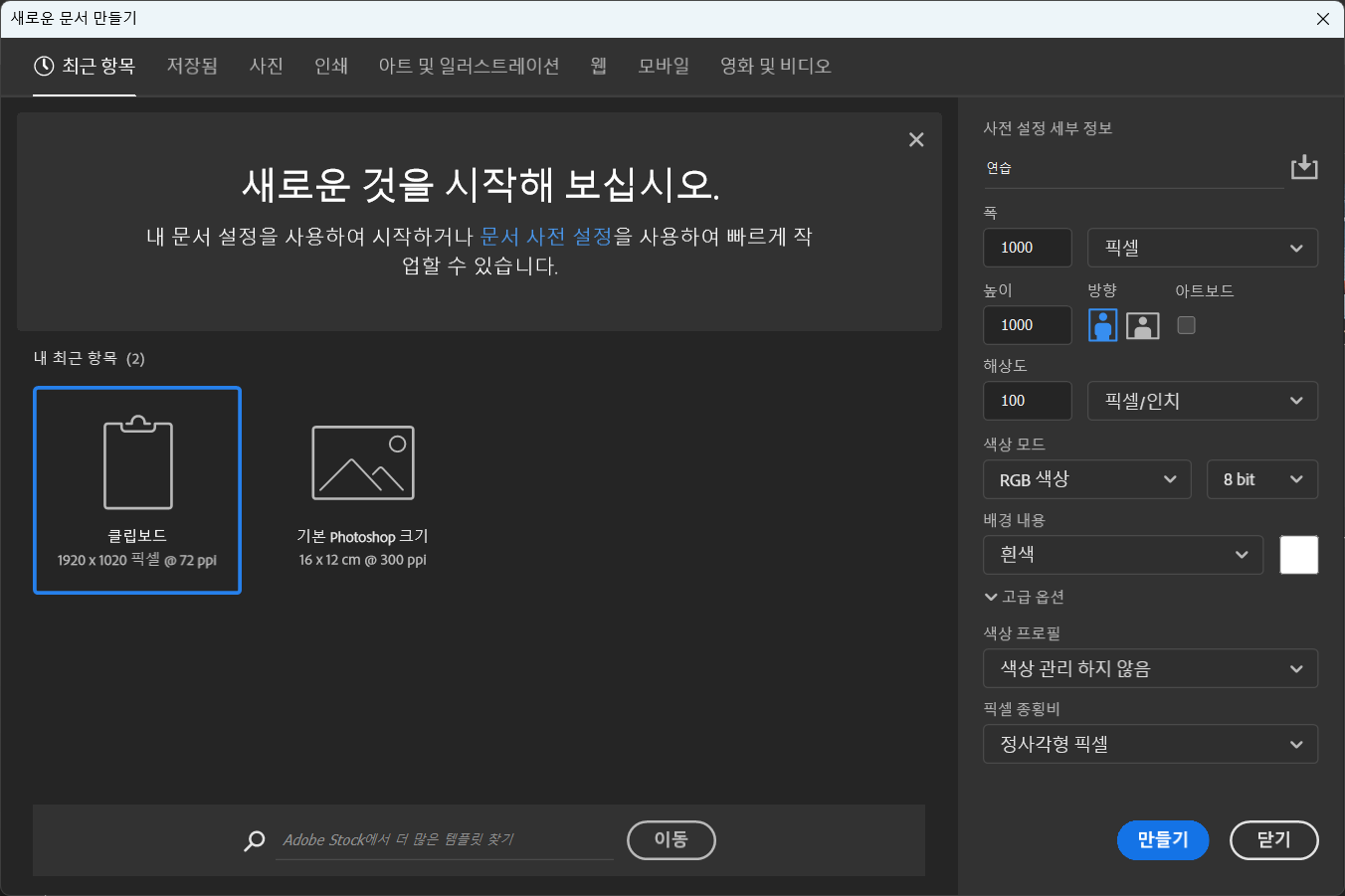포토샵을 실행하고 새 파일을 클릭하면 새로운 문서를 만들 수 있다.