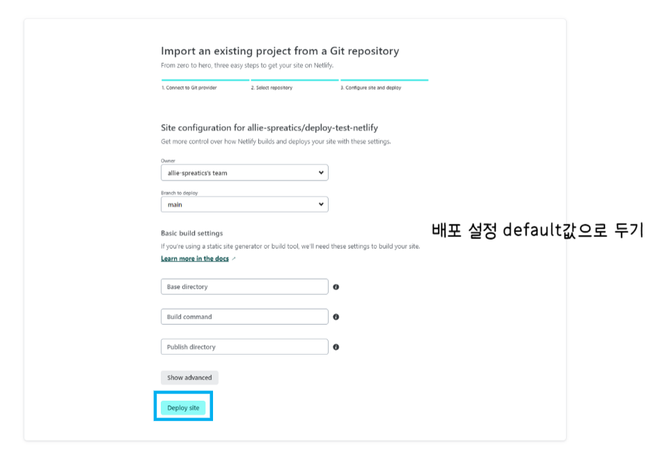 5. 배포하고 싶은 repo를 선택하고 배포 설정을 defalut값으로 두고 배포를 완료한다.