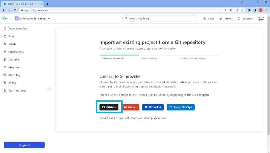 4. netlify에서 Team overview - Import from Git - Github를 클릭한다.