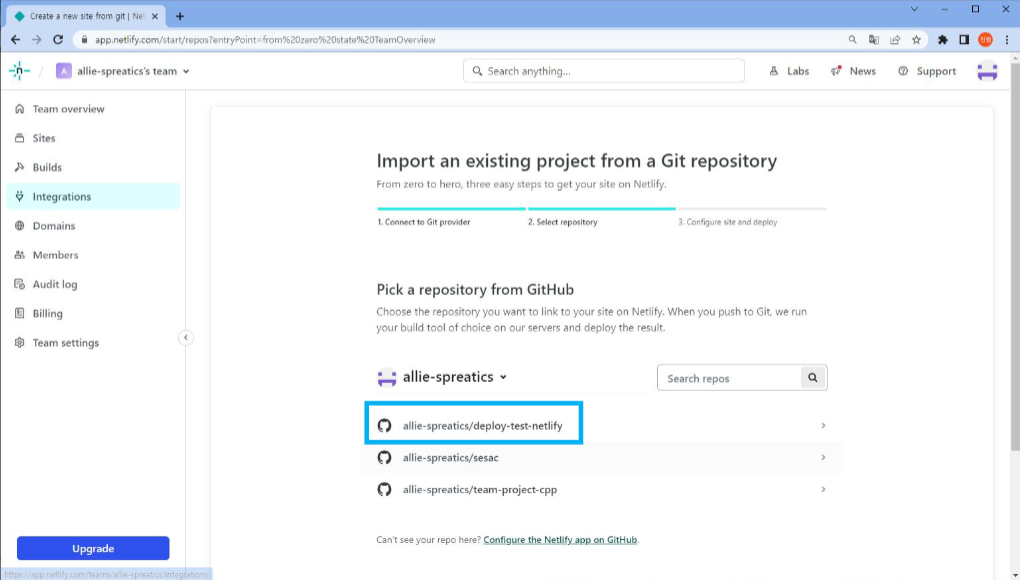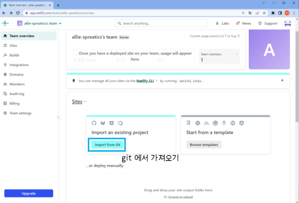 4. netlify에서 Team overview - Import from Git - Github를 클릭한다.