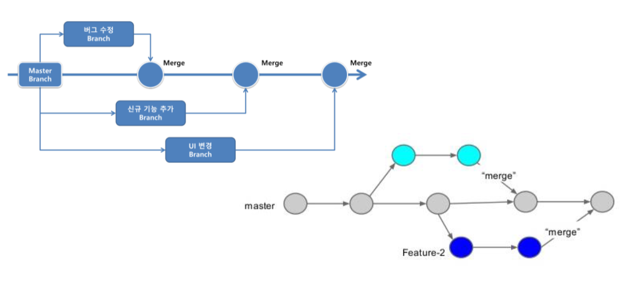 ex) A라는 사람이 '로그인' 기능을 만들고 B라는 사람이 '버그 수정'을 할 때 A와 B는 최초 Branch에서 파생한 각각의 Branch를 만들어 작업을 진행하고 최초 Branch로 Merge를 통해 각자가 작업한 것을 합칠 수 있다.