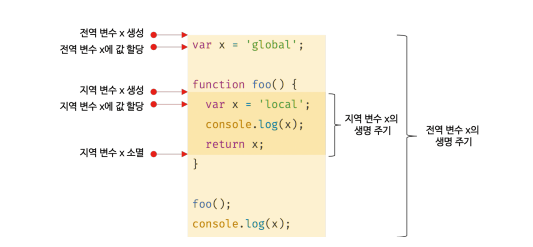 함수를 호출하면 함수 몸체의 다른 문들이 순차적으로 실행되기 이전에 함수 안 변수의 선언문이 자바스크립트 엔진에 의해 가장 먼저 실행되어 변수가 선언되고 undefined로 초기화된다. 그 후, 함수 몸체를 구성하는 문들이 순차적으로 실행되기 시작하고 변수 할당문이 실행되면 변수에 값이 할당된다. 그리고 함수가 종료되면 변수도 소멸되어 생명 주기가 종료된다. 즉, 지역 변수의 생명 주기는 함수의 생명 주기와 일치한다.