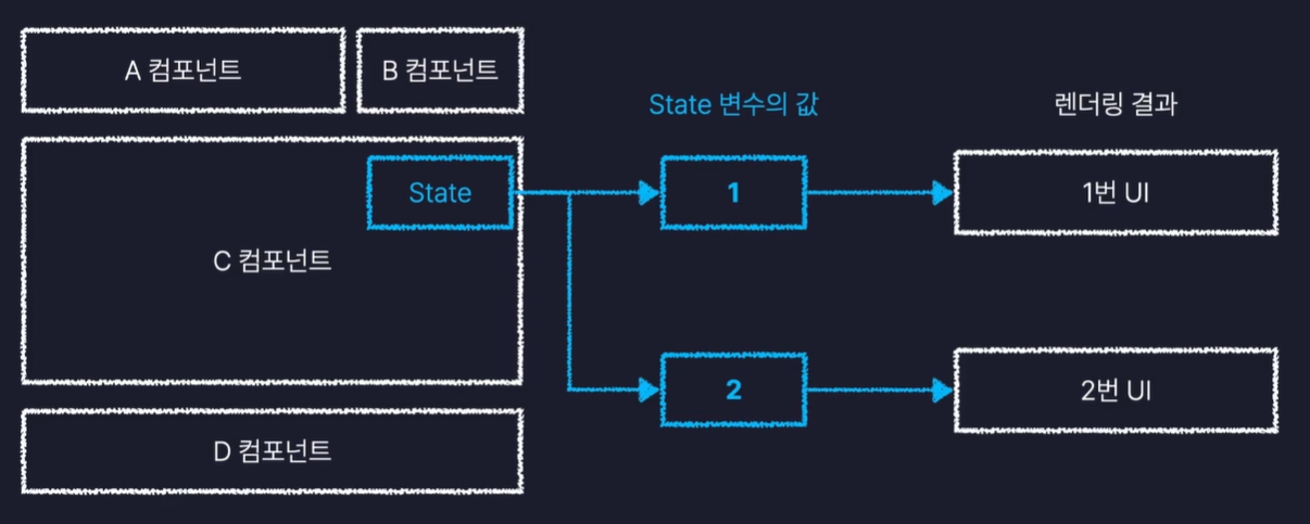 리액트에서는 페이지를 컴포넌트 단위로 나눠서 개발하게 되는데 각각의 컴포넌트에는 state라는 현재의 이 컴포넌트의 상태를 저장하는 특수한 변수를 저장할 수 있다. state의 값이 변경되면 변경된 state 값에 따라서 각각 다른 UI가 렌더링되도록 설정할 수 있다.